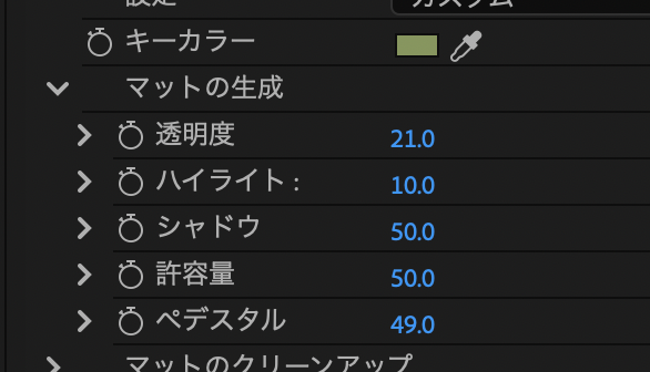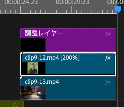 - グリーンバックのクリップを速度200%にし、その尺に上下クリップをあわせる