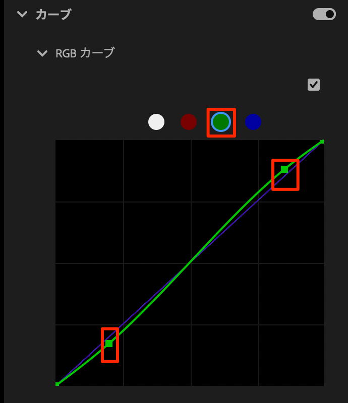 - 明るい部分でのグリーンを持ち上げ、暗い部分で下げる