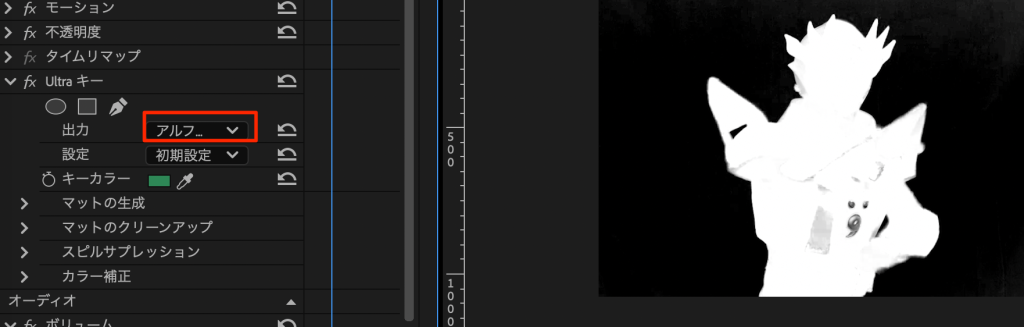 - 出力をアルファチャンネルにするとアルファの状態が確認できる(白が1,黒が0)