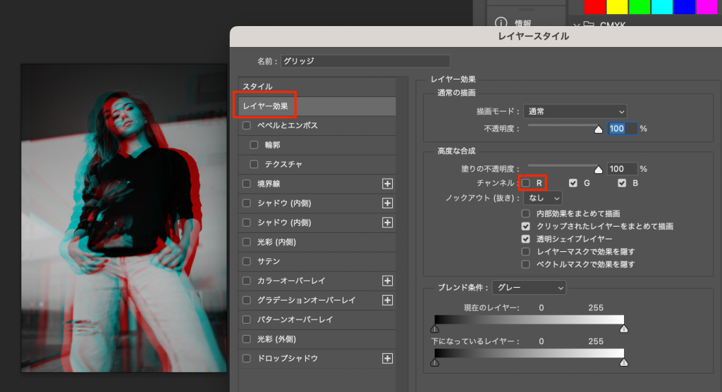 - レイヤースタイルを開き レイヤー効果のチャンネルを外す