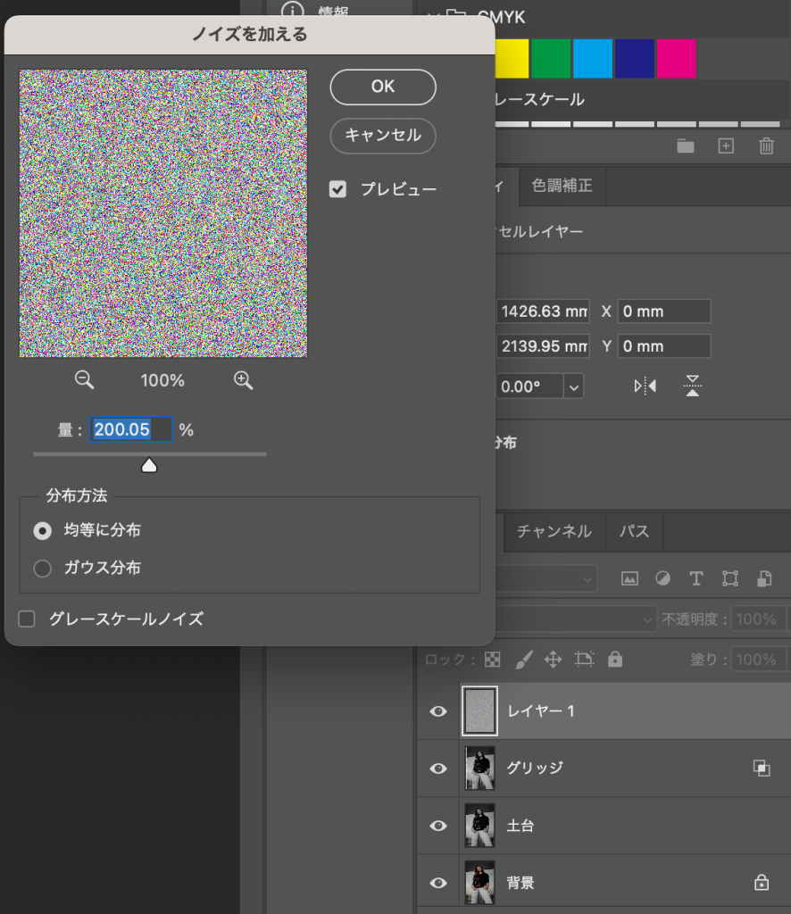 - ベタ塗りレイヤー(白)を追加し、フィルター ノイズを加える
