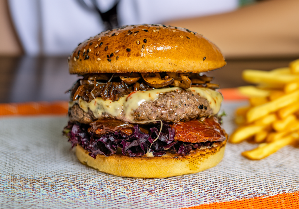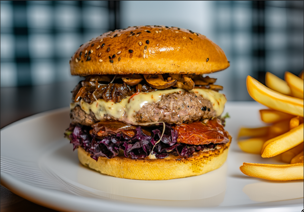 - Prompt: “A juicy hamburger placed on a clean white plate, accompanied by crispy golden French fries. In the background, a simple bright setting with a small green potted plant adding a fresh touch.”