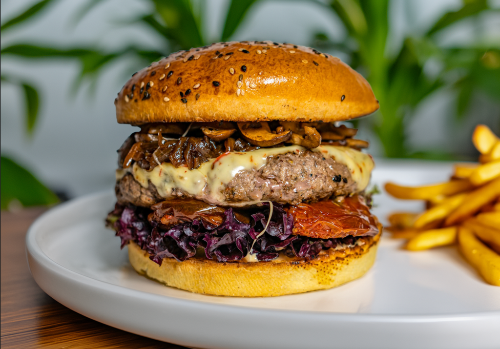 - Prompt: “A delicious hamburger on a clean white plate with crispy golden French fries. In the background, lush green indoor potted plants near the plate, providing a natural and vibrant setting.”