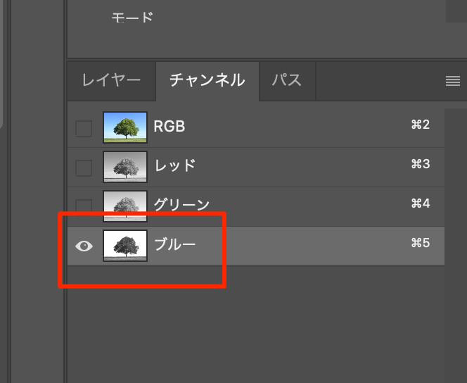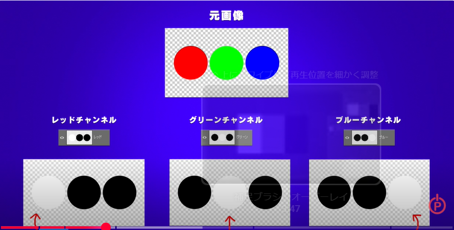 - カラーチャンネルはその色がたくさん含まれていると白、そうでない場合は黒で表示される