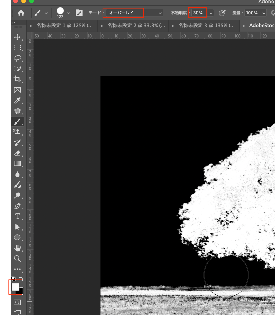 - ブラシのモードをオーバーレイにし、不透明度30%で境界線をなぞる
