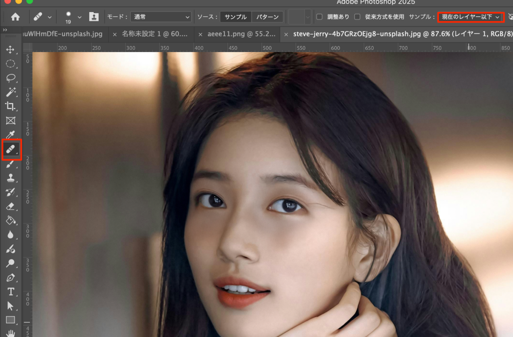 • 修復ブラシツールを選択->現在のレイヤー以下を選択する