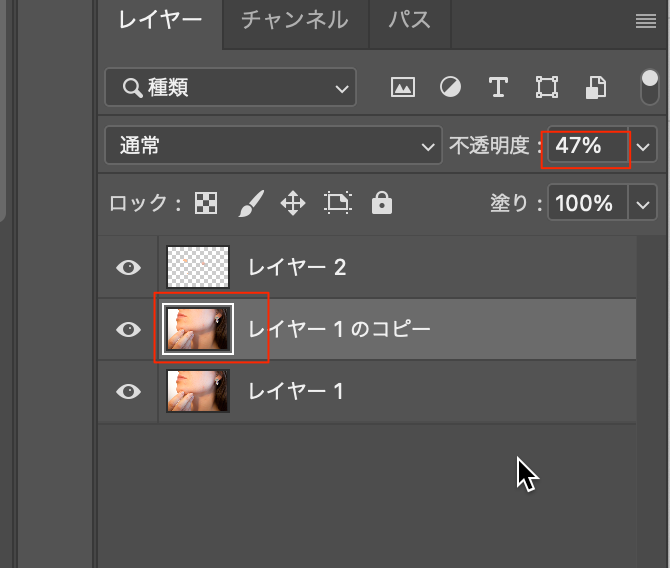 また、つよく効きすぎて不自然さを感じる場合はこのレイヤーの不透明度を少し下げるとよい