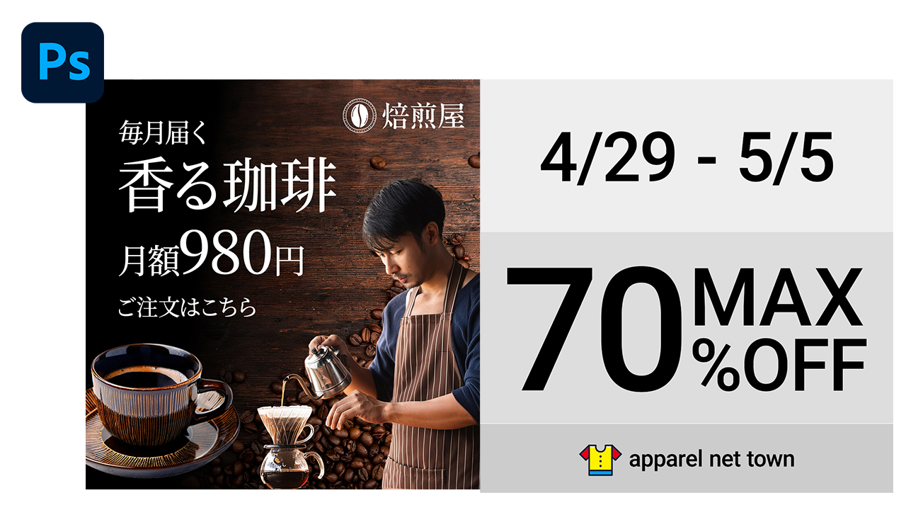 PS 文字と画像をレイアウトしよう3 Photoshop 2025.04.10 目次 チュートリアル成果物 作業のながれ分割したレイアウト縦横作成を終えた感想 チュートリアル Adobe公式 Creative College(実践バナー編) 成果物 作業のながれ 分割したレイアウト縦 Before after 横 before after 作成を終えた感想 モノトーン色分け グラデ座布団による分割