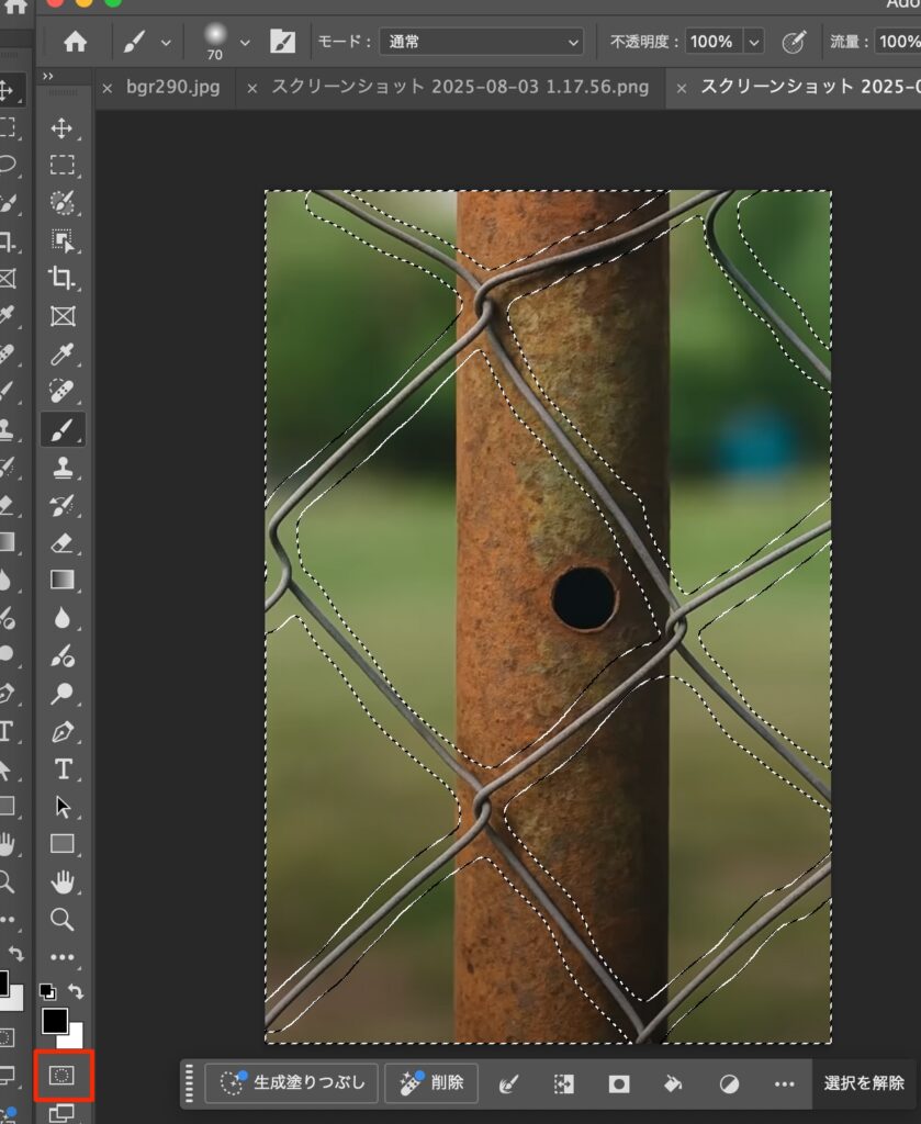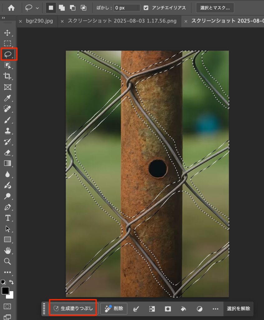 Remove trick Photoshop 2025.07.292025.08.05 目次 チュートリアル作業のながれ成果物 作成を終えた感想 チュートリアル https://www.youtube.com/watch?v=6uaeBSTHOYQ?si=srheXOBNw-7ZrF8L 作業のながれ マスクモードにして塗る マスクモードを解除 選択範囲が逆になってる場合はcmd +i 投げ縄ツールを選択して生成塗りつぶし 成果物 作成を終えた感想 完璧に消せたすごい。。。
