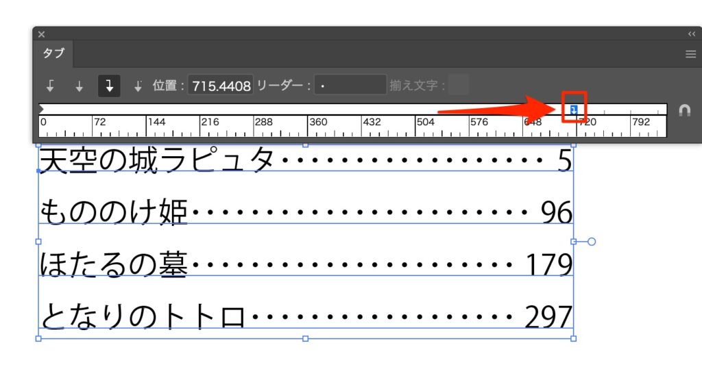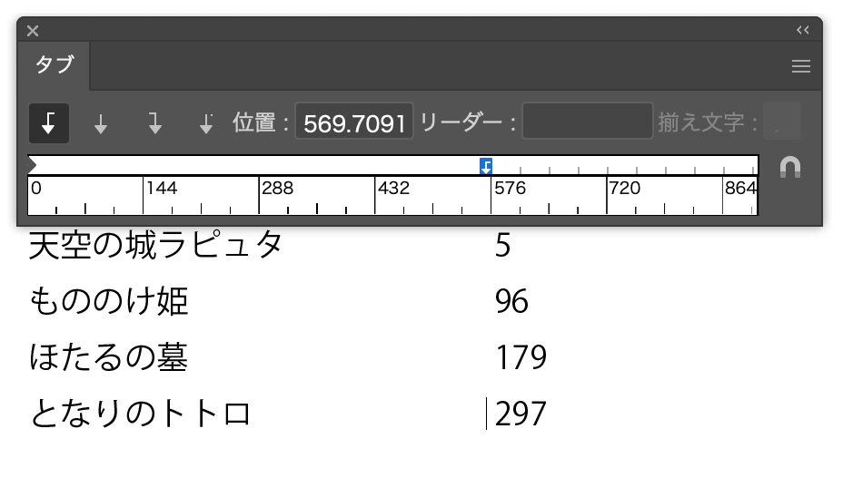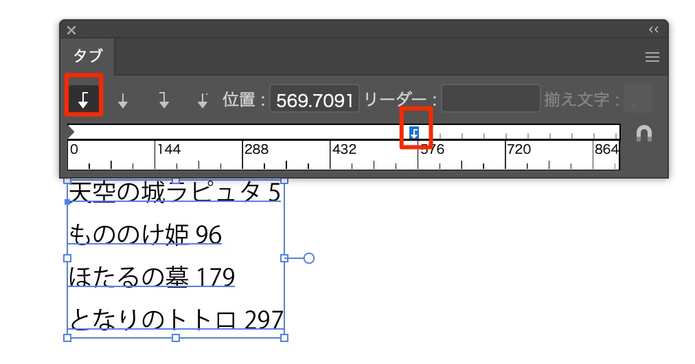 メニュー作りに欠かせない!タブ機能 Illustrator 2025.11.262025.11.28 目次 チュートリアル成果物ポイント感想 チュートリアル 成果物 ポイント テキストツールで任意の文字を入力 cmd + shift + t 左揃えになっていることを確認して、クリックして揃えたいポイントを挿入する テキストツールで移動させたい文字の手前でtabを押す 右揃えを選ぶと右揃えになる リーダーに文字を入れると隙間を埋める タブの位置はドラッグで変更できる 感想 タブ機能が難しすぎるので学習 便利そうなんだけど、結構バグる