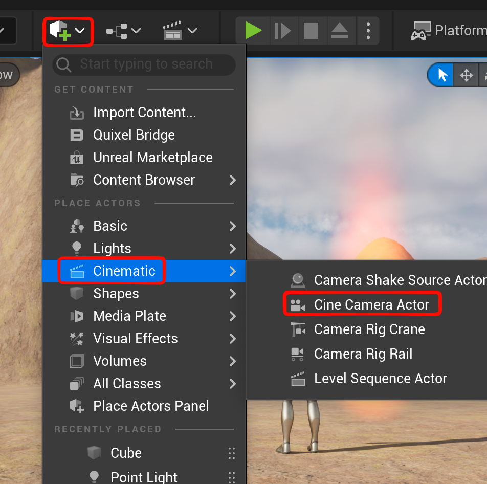 - cine Camera actorを配置