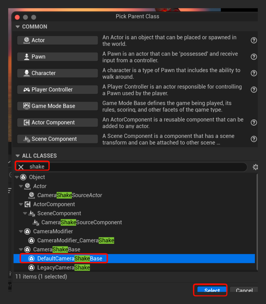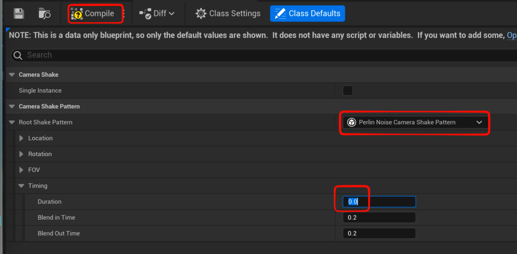 - 新規にBPを作成->Default Camera Shake Base