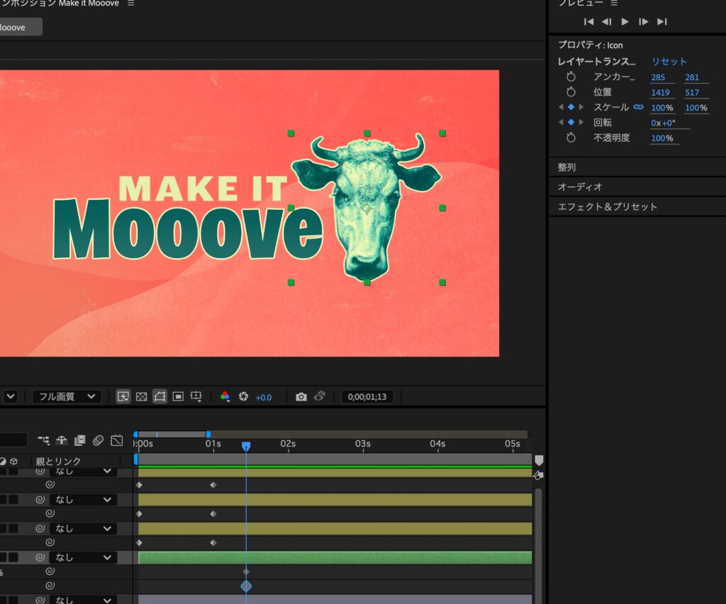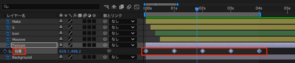 - レイヤーを選択して、プロパティで項目を選択するとキーフレームが追加される