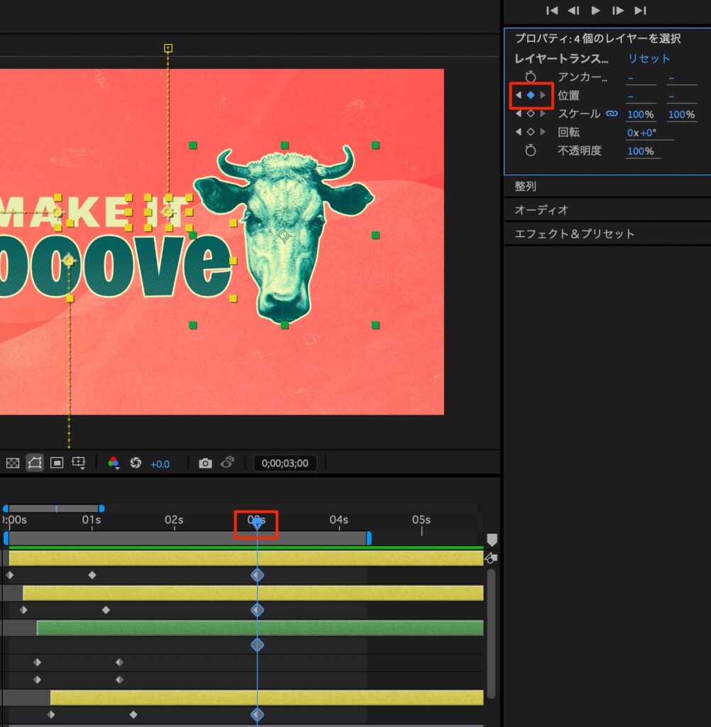 - 複数レイヤーを選択してプロパティパネルからキーフレーム挿入