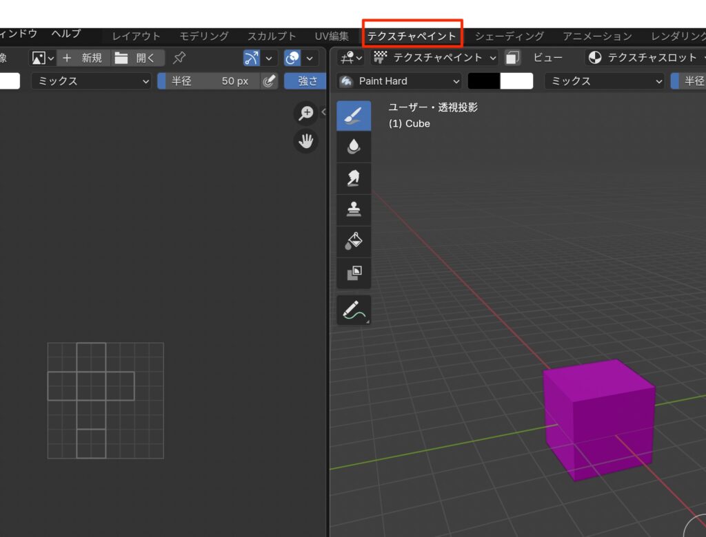 - 上部のタブからテクスチャペイントを選ぶ