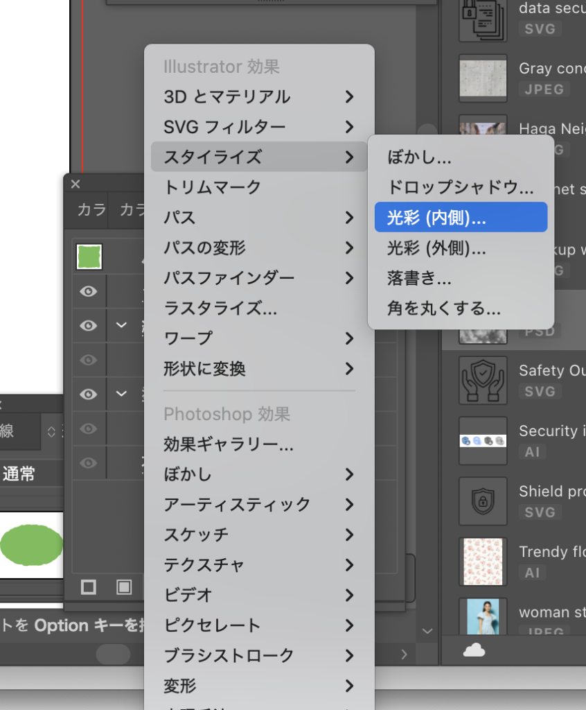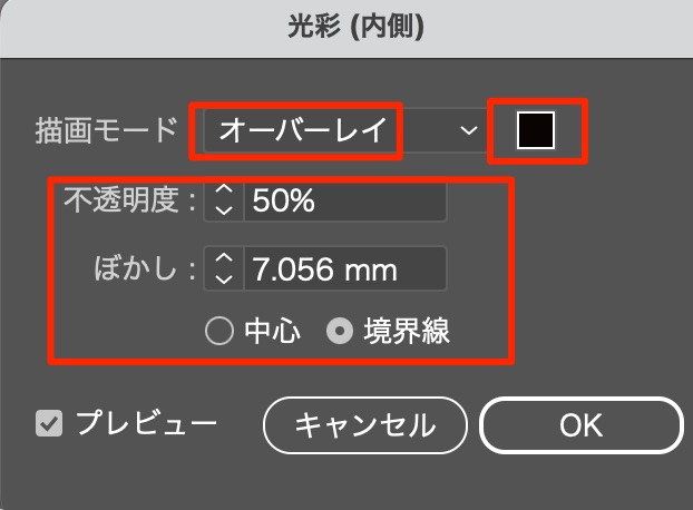 - アピアランスパネル下部fx > スタイライズ> 光彩(内側)